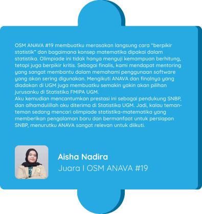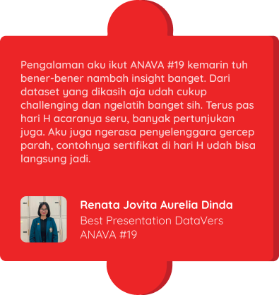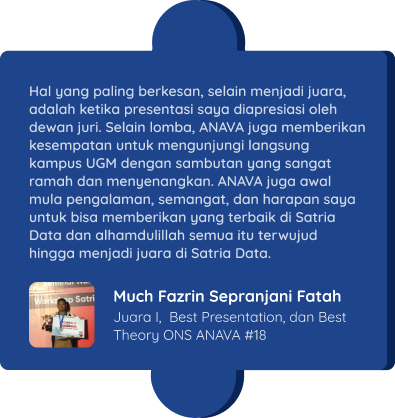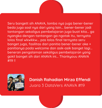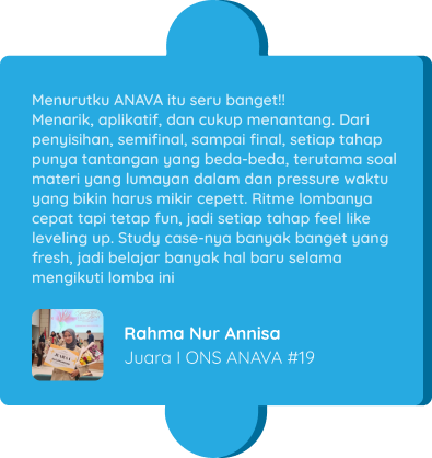 Di ANAVA #20, setiap cabang kompetisi adalah papan permainan tempat para pelajar SMA dan mahasiswa menguji logika dan kreativitas dalam berbagai tantangan seru berbasis data. Baik kamu pejuang UTBK, pecinta olimpiade, atau penggemar data, semua punya tempat untuk bersinar di antara yang terbaik. Siapkan strategimu, pilih lombamu, dan buat langkah terbaikmu!